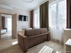 Трехэтажное здание, 2-местные однокомнатные номера, с современным интерьером. В каждом номере установлена сплит-система, телевизор, доступен беспроводной интернет, а в санузле – душ.